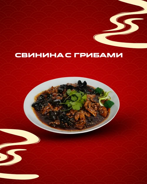 Обжаренная сочная свинина с древесными грибами и традиционными специями, классика Китайской кухни